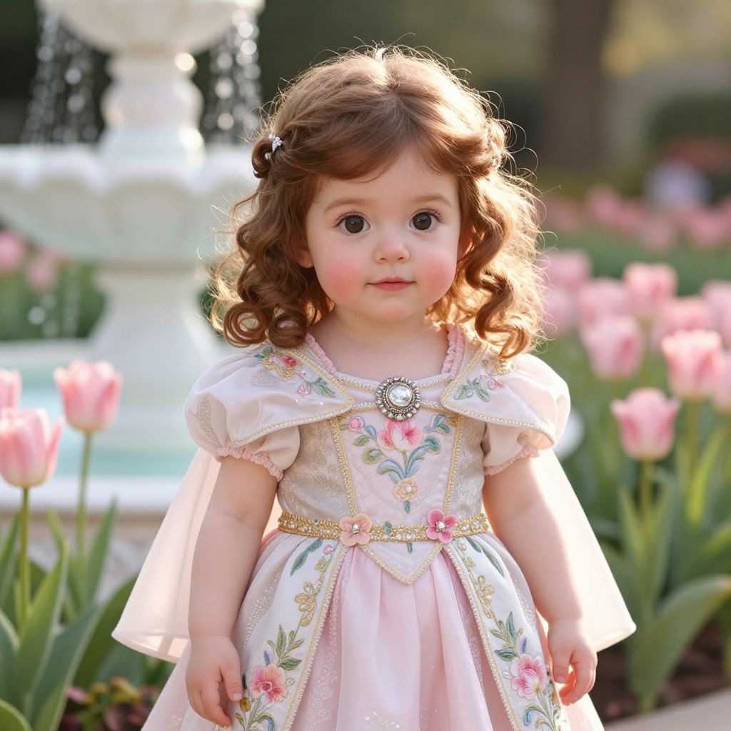 A detailed, naturalistic scene of a child-sized princess melody costume, showing a girl with soft pink cheeks, large round eyes, and curly chestnut hair wearing the full outfit—complete with a floral sash, embroidered cape, and delicate silver brooch—standing in a whimsical garden with pink tulips and a crystal fountain in the background, lit by warm afternoon sun.