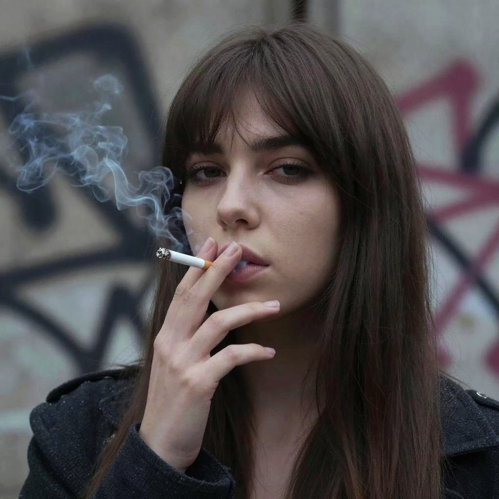 This is a close-up photograph of a young woman with straight, brown hair and bangs, smoking a cigarette. She has light skin, dark eyes, and a serious expression. She's wearing a dark, textured jacket, and her hand is raised to her mouth with the cigarette between her fingers. The background is blurred with graffiti. The lighting gives a slightly moody, urban vibe.