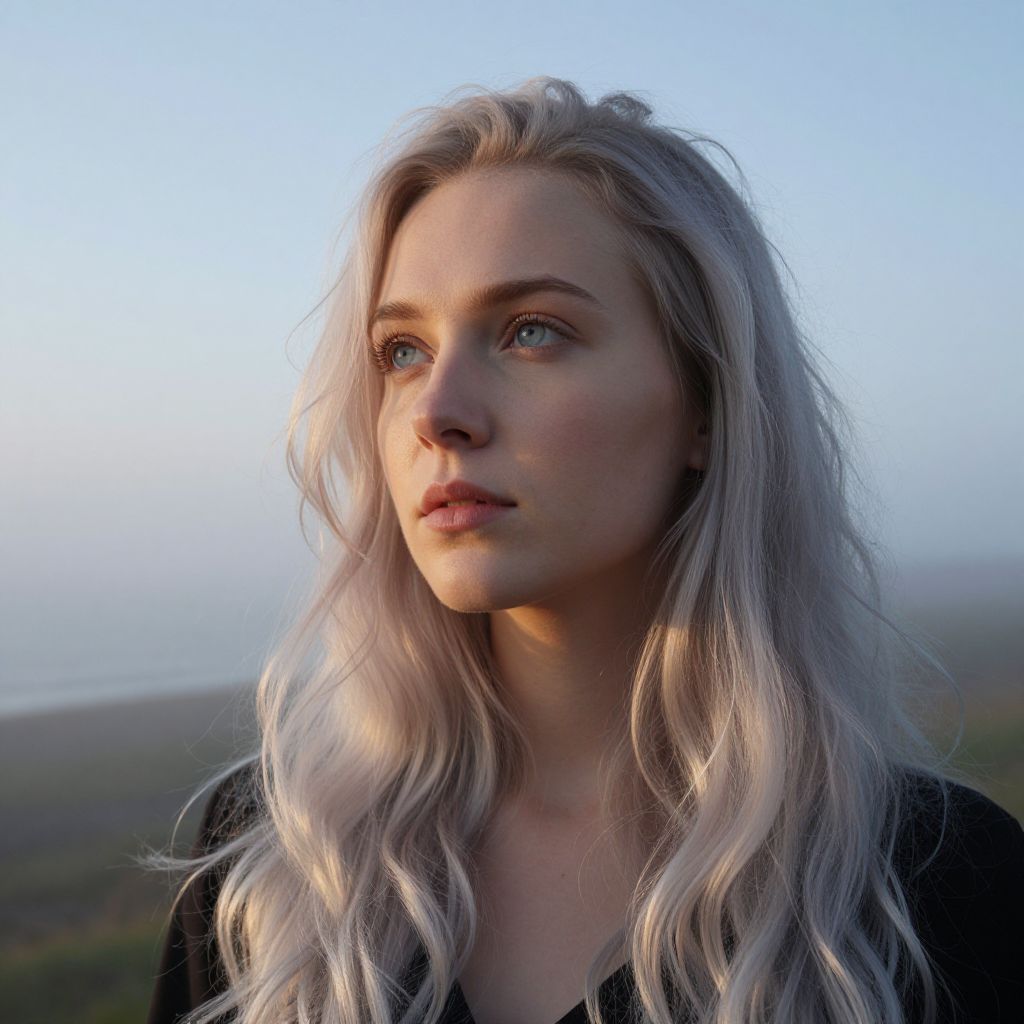 Imagine a portrait captured with a DSLR, showcasing a young Slavic woman's transparent gaze and striking blue eyes amidst her long, wavy platinum hair cascading over her shoulders like liquid silver. Against an atmospheric backdrop of a foggy coastal landscape at dawn, soft golden light filters through the mist to illuminate her delicate features and cast elongated shadows across her face. From an unusual low-angle perspective, she gazes pensively towards the horizon, her expression conveying deep introspection and contemplation that draws viewers into a mesmerizing exploration of her open presence and timeless beauty.