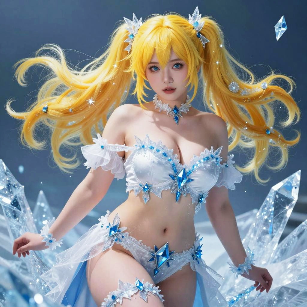Realistic photo.Illustration of Curvy girl, twin tail yellow hair, sultry expression, high heels, ice magic, cleavage, white and blue color scheme, cute face, detailed curves, high-res, fantasy, digital art, magical atmosphere, skimpy, sultry gaze, ice crystals, detailed clothing, high quality, detailed, fantasy art, digital painting, enchanting lighting, slutty, revealing, underwear realistic photo