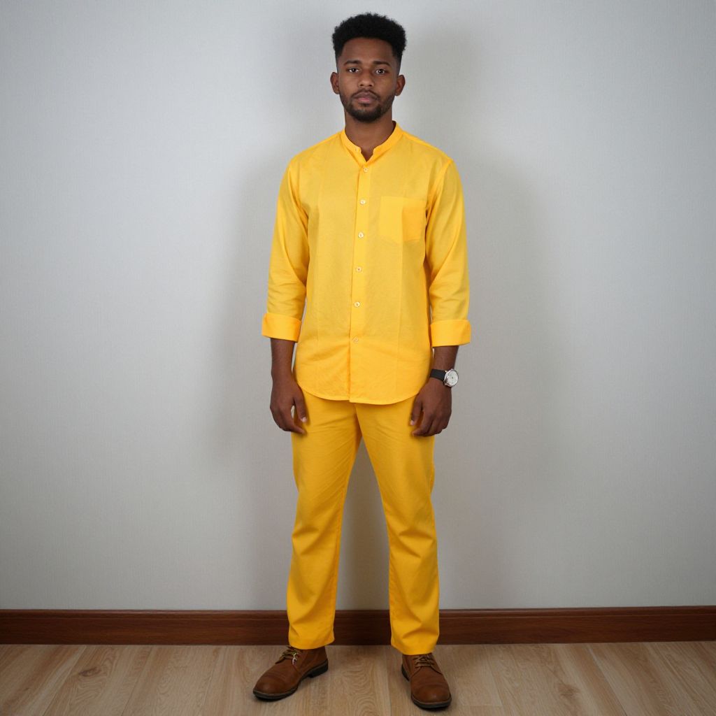 Photograph of a Black man standing against a plain white wall with light wooden flooring. He has short, curly black hair and a trimmed beard. He wears a bright yellow, long-sleeved button-up shirt paired with matching yellow pants, and brown leather shoes. His right wrist has a white watch. He stands with a neutral expression, arms relaxed by his sides. The lighting is even, highlighting the vivid color of his outfit against the minimalistic background.