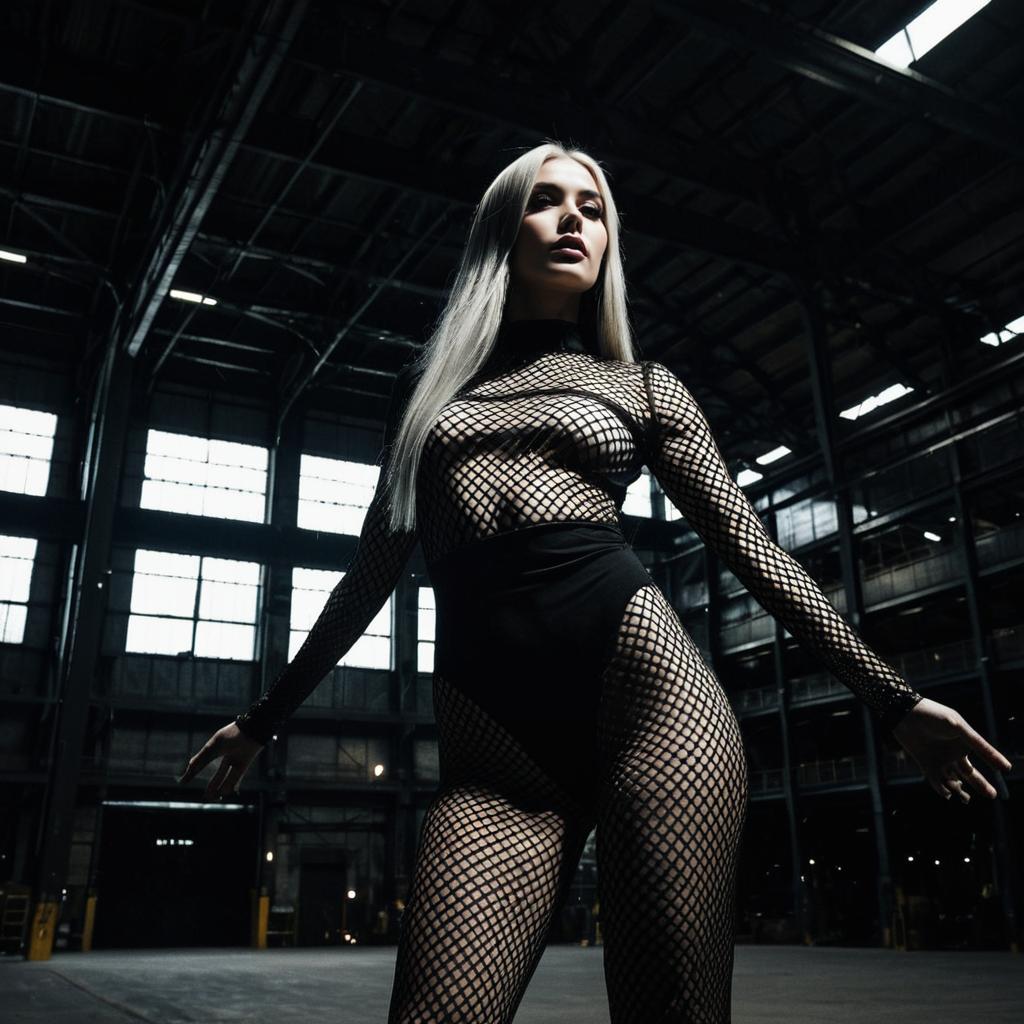 Model in Sheer Fishnet Gothic Dress in Industrial Warehouse