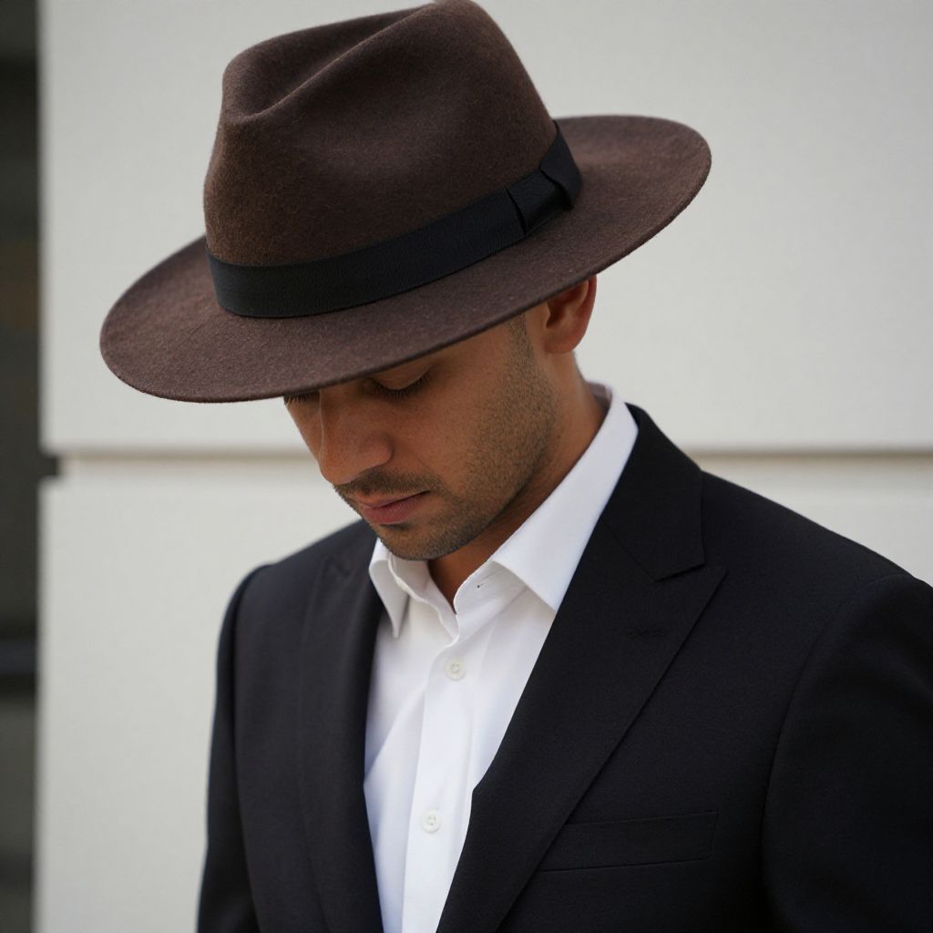 Man wearing a black suit with a white shirt and a brown hat.