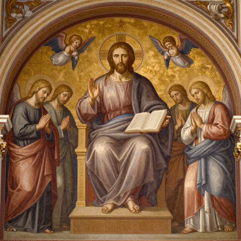 Pantocrator scene in a grand cathedral fresco style, Christ enthroned with open gospel, surrounded by saints and angels, naturalistic brushstrokes combined with iconic stylistic features, warm earth tones and gold highlights, reflecting divine authority and spiritual grace.