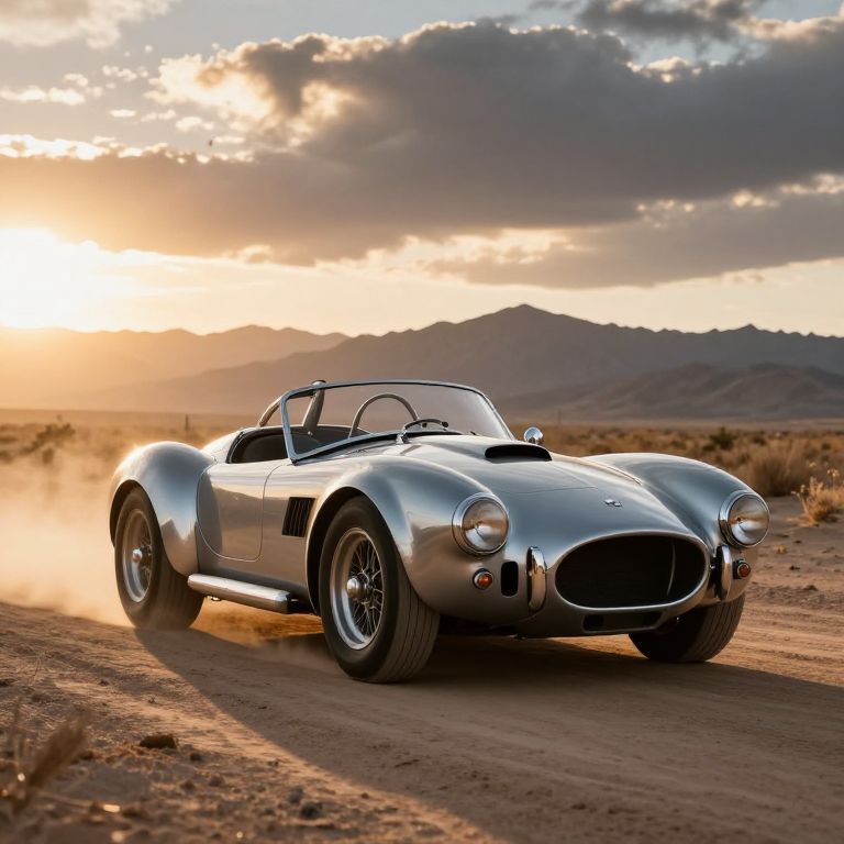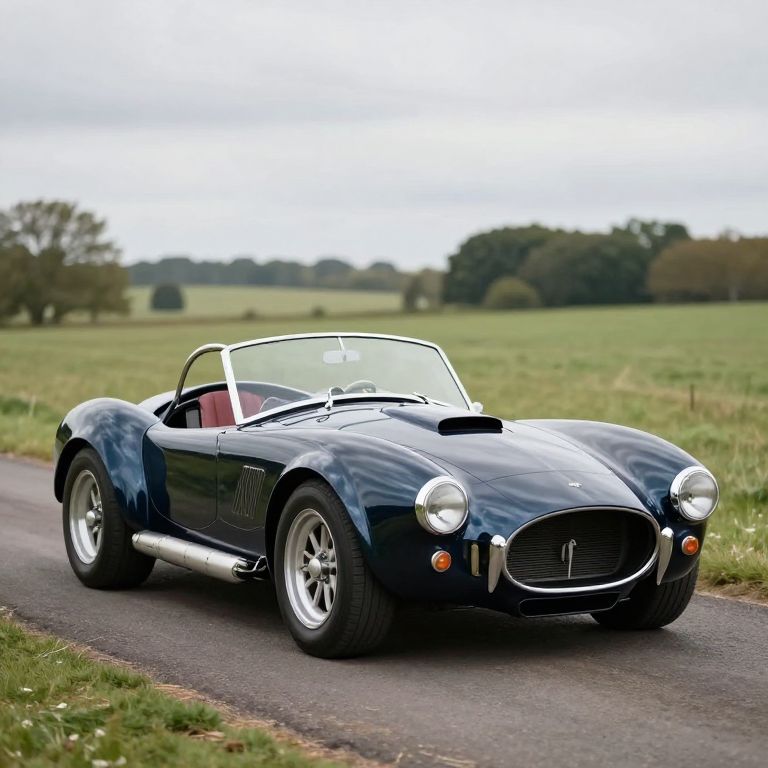 Shiny blue Shelby Cobra convertible with bold white racing stripes and classic round headlights prominently displayed against a minimalist studio backdrop.