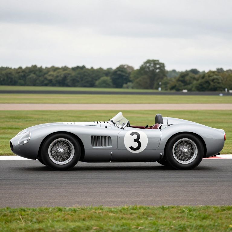 Photograph of a sleek, blue vintage convertible sports car with a shiny, metallic finish. The car features a prominent white racing stripe running down the center of its hood. It has round, chrome-rimmed headlights and a large, chrome grille. The front bumper is low and wide, and the car's hood is smoothly curved. The background is a simple, gradient gray, highlighting the car's striking design. The car's tires are black with visible treads, and the windshield is clear, suggesting an open-top model. The overall aesthetic is classic and elegant, emphasizing the car's timeless beauty.