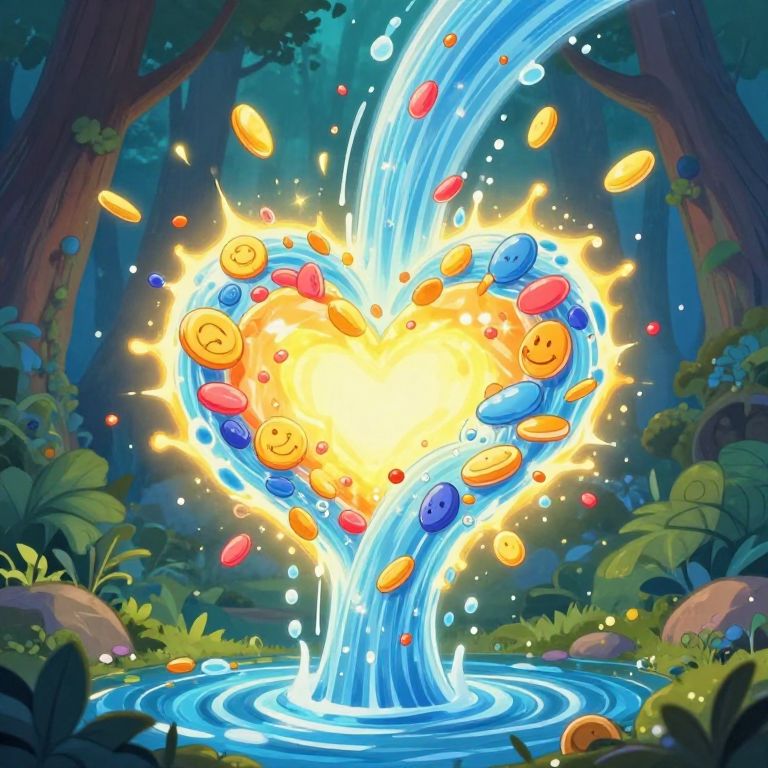 Excessive praise or flattery visualized as a river of glowing compliments flowing endlessly into a glowing heart, mystical forest background, vibrant colors, fantasy art style