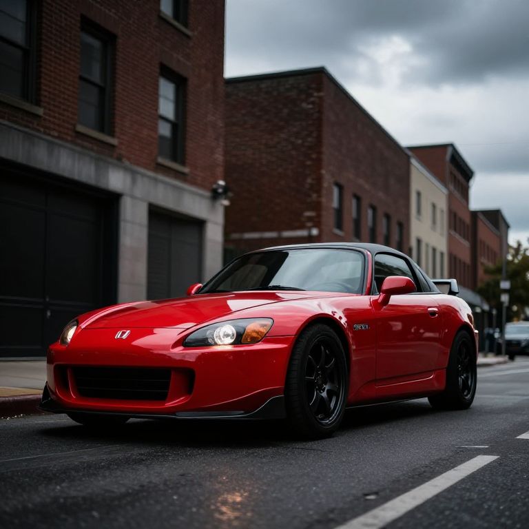 White Balance Red Honda 2001 s2000, editorial style photo, low angle camera shot, urban street, city center, brick buildings, reflective surfaces, dramatic overcast lighting,
