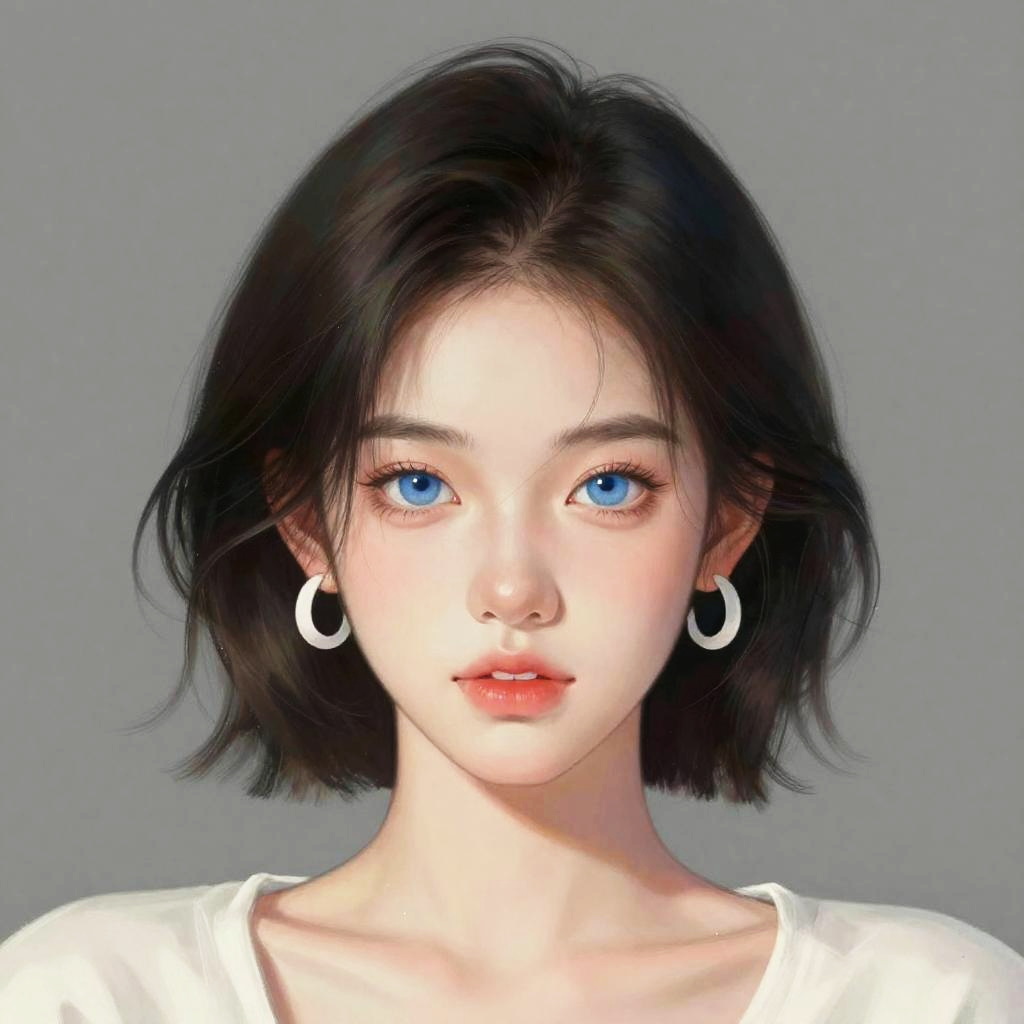 This is a digital drawing of a young woman with short, dark wavy hair and bright blue eyes. She has fair skin with a slight blush, and her lips are pink and slightly parted. She's wearing white, circular earrings and a subtle, light-colored top. The background is a simple, gradient gray. The art style is realistic with a slight, almost glowing effect on her face.