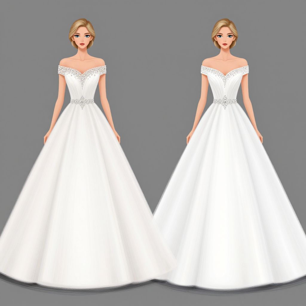 Elegant ball gown wedding dress sketches featuring two identical off-the-shoulder designs with sparkling embellishments at the neckline and waist, showcased through side-by-side illustrations of a blonde woman in a flowing, full-length white gown.