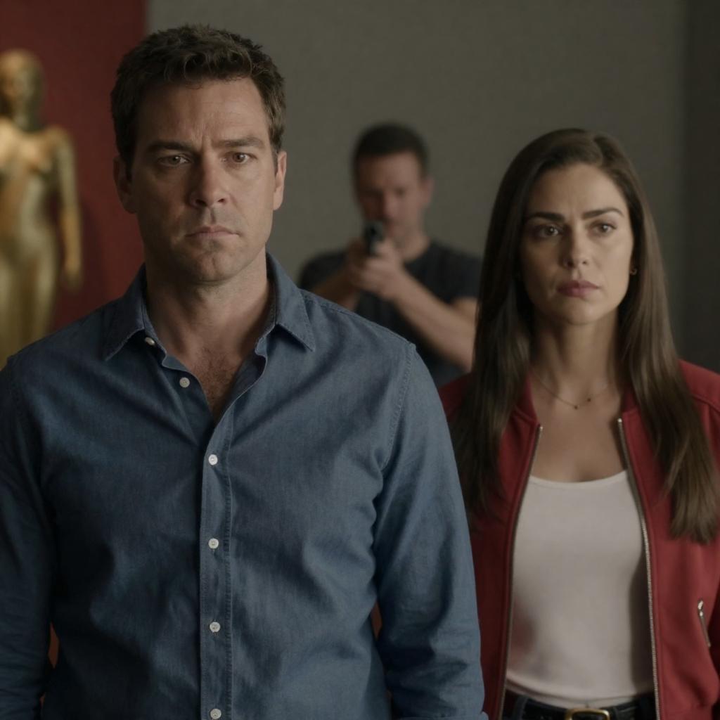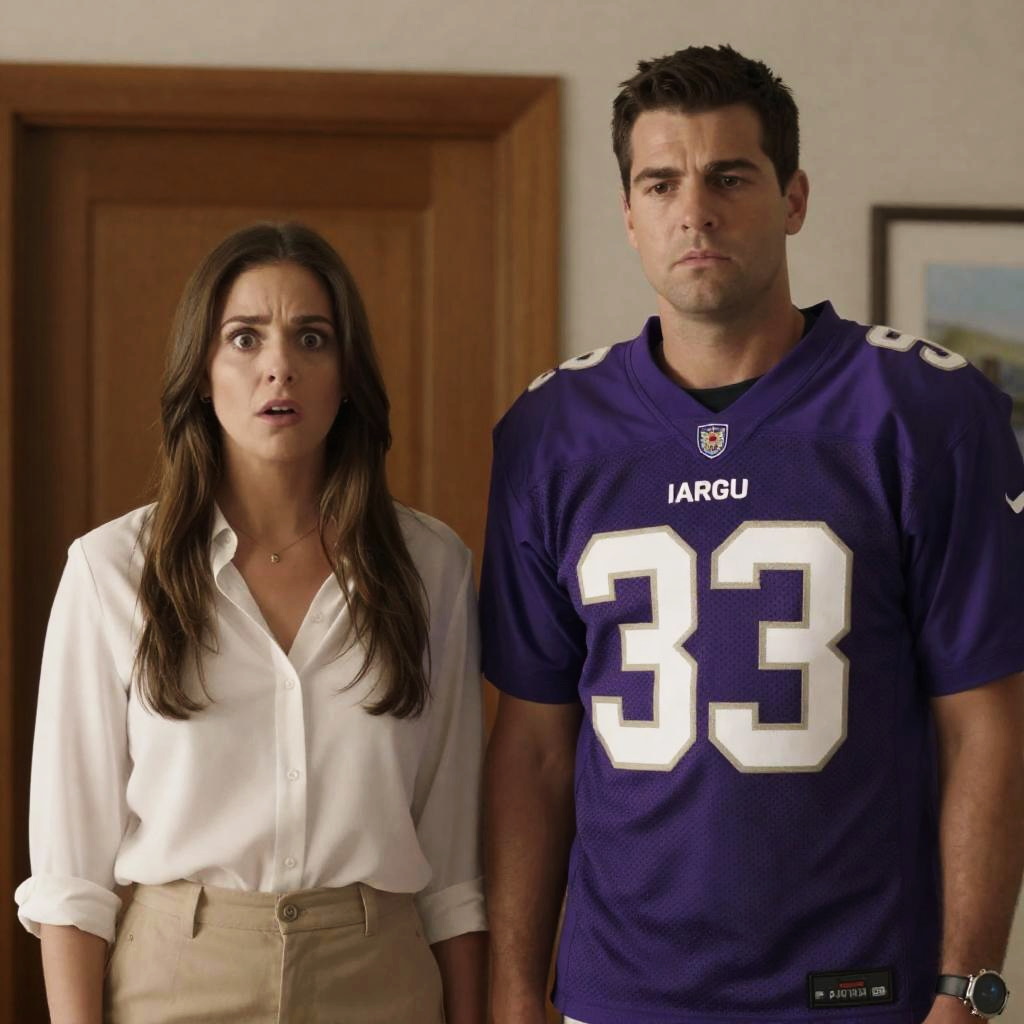 Photograph of two people standing indoors. Woman with long brown hair, wearing beige shirt and white blouse, looking surprised. Man with short dark hair, wearing purple football jersey with number 33, looking serious. Background includes wooden wall and door.