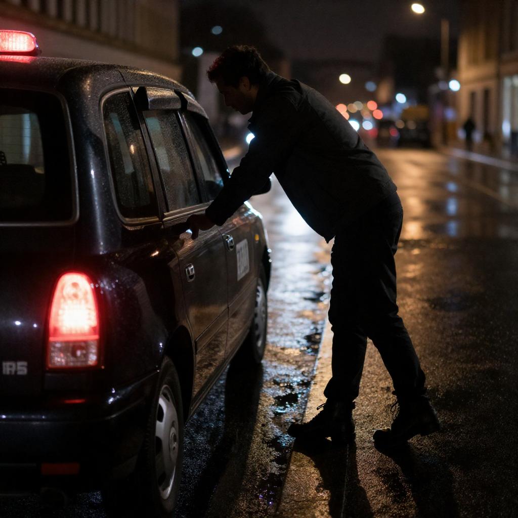 Photograph of a city street at night. A person with a blue beanie, orange jacket, white pants, and black backpack walks away from the camera, passing a bright blue car with headlights on. A yellow taxi and blurred pedestrians are in the background. The scene is illuminated by streetlights, creating a contrast between the bright car and darker surroundings.