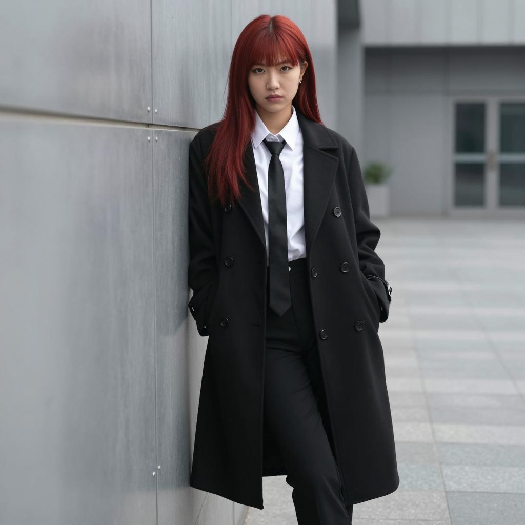 Young Asian woman with long blonde hair standing on a city street crosswalk during daytime. She is wearing a gray cardigan over a red shirt, paired with a knee-length plaid skirt, black socks, and black shoes. The urban background features tall buildings, trees, and parked cars. The woman has a confident stance with legs apart and one hand touching her hair.