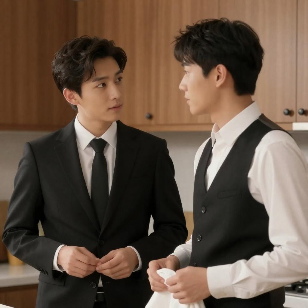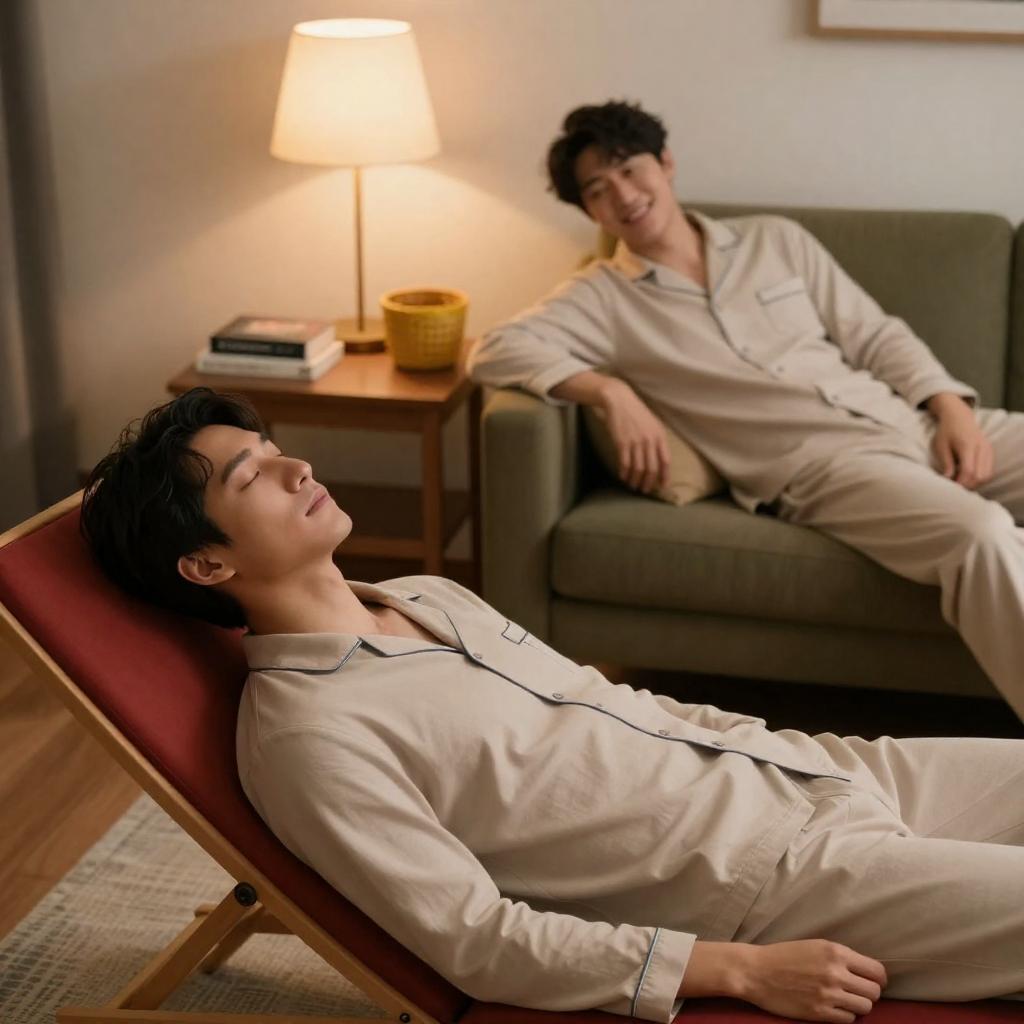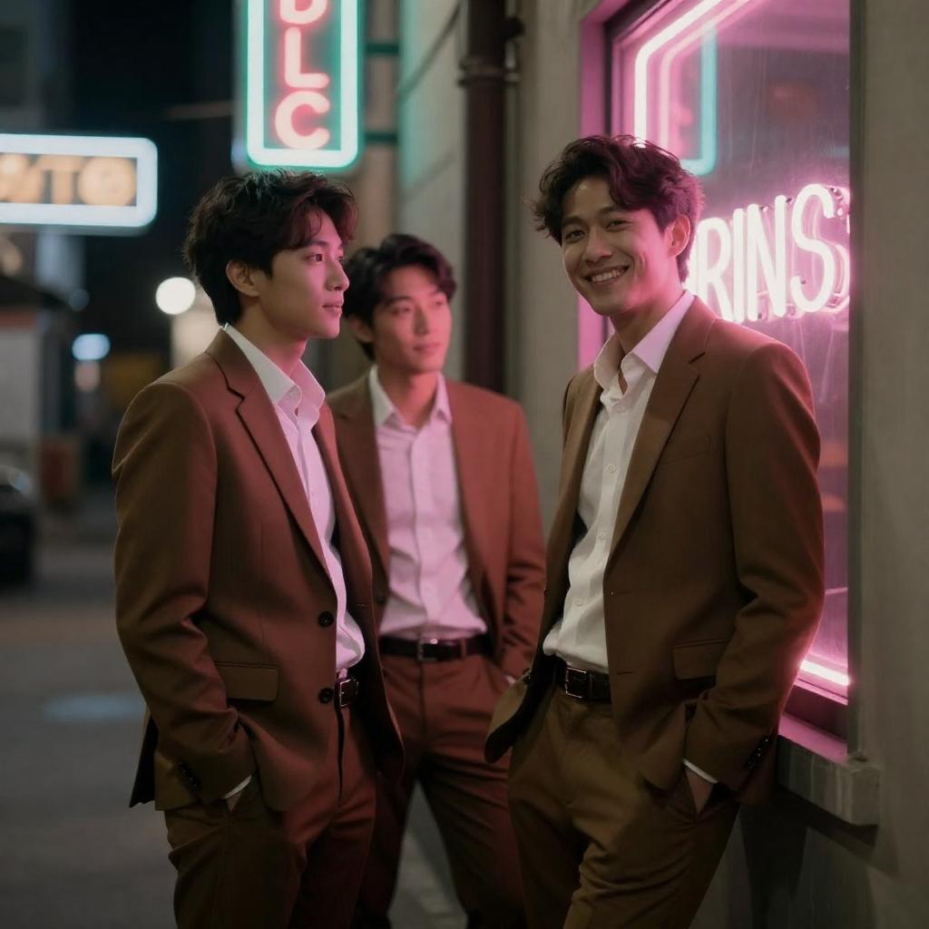 Photograph of three men in brown suits standing in a dimly lit urban alleyway, illuminated by neon signs. One man leans against a brightly lit window with neon lights, smiling. Another man stands to his left, while the third is partially obscured. Neon signs in green and pink glow in the background.
