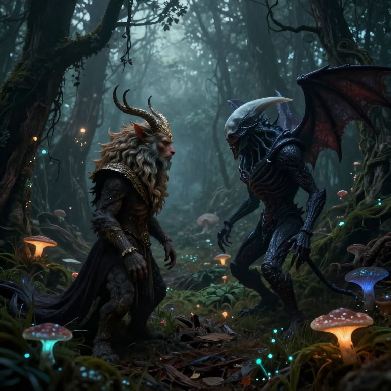 Visualize an enigmatic encounter between a regal mythical beast and a malevolent otherworldly entity in a surreal landscape reminiscent of Dali's dreamscapes and Giger's nightmarish visions. Set within the shadows of a dark, misty forest, observe their captivating interaction from an overhead perspective that offers a unique vantage point. The scene is illuminated by the eerie glow of bioluminescent fungi, creating an atmosphere of awe and trepidation as it showcases the contrast between nature's grace and cosmic terror in this hauntingly alluring tableau.