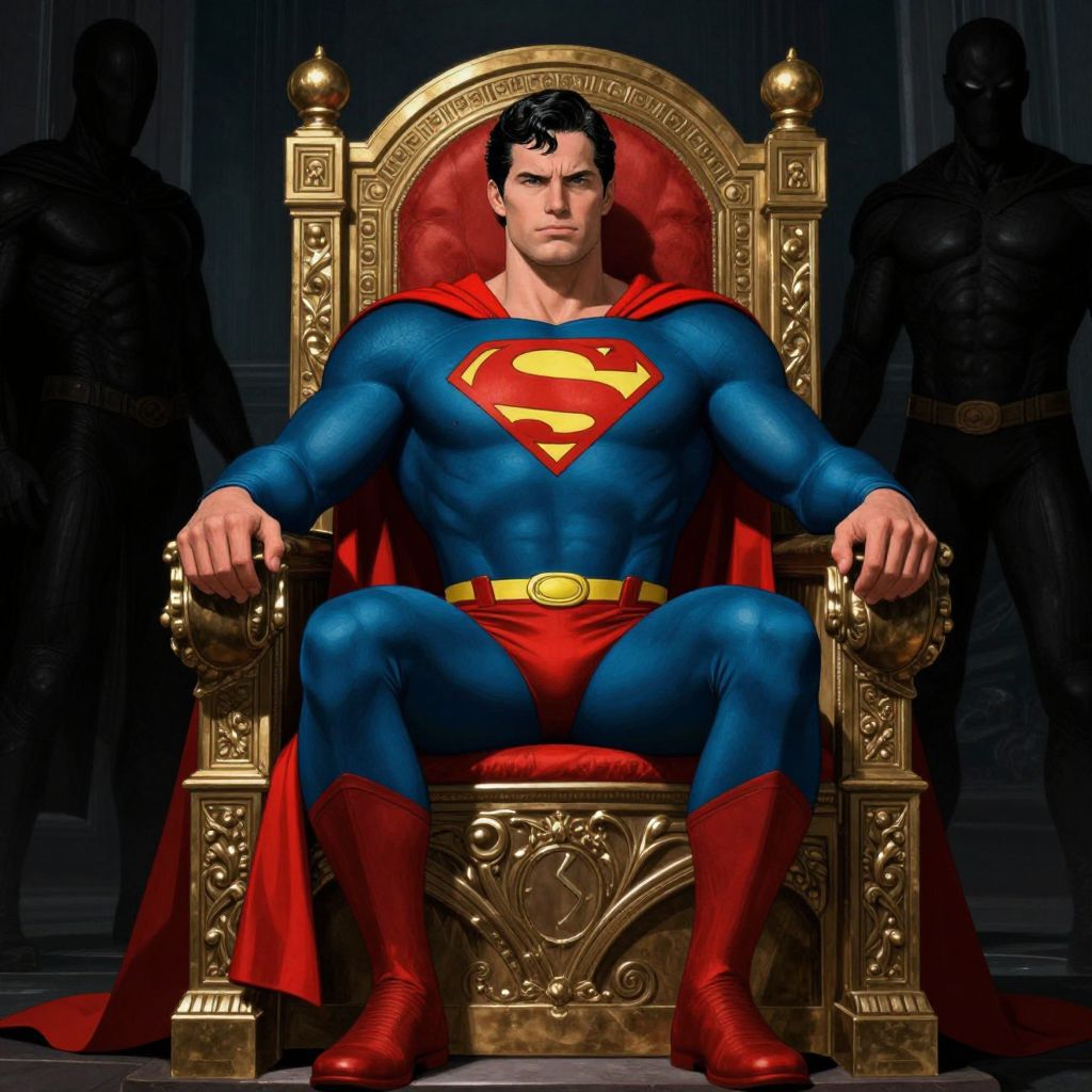 This is a digitally altered photograph featuring three men in a dramatic, comic-book style. The central figure is a muscular man with dark, curly hair, wearing a blue, skin-tight superhero suit with a red cape and a large, red "S" emblem on his chest. His expression is intense and determined. To his left, a bearded man with brown hair and a leather jacket looks serious. To his right, another man with light brown hair and a concerned expression is dressed in a brown robe with a blue and yellow sash. The background includes a detailed, painted portrait of a regal figure in gold and blue, and a flag with stars on the left.
