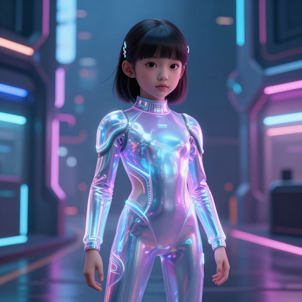 Photorealistic CGI of an Asian boy in futuristic space suit with blue glowing chest emblem, black headphones, standing in cosmic background with planets.