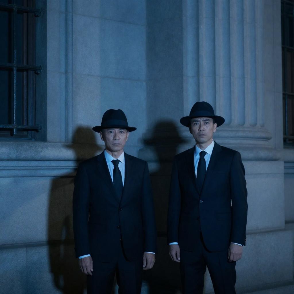 Man in brown suit, white shirt, red-striped tie, black hat, standing in front of Gothic-style church. Blue sky, daytime. Car partially visible on right. Man looking up, serious expression. Church features tall spires and arches.