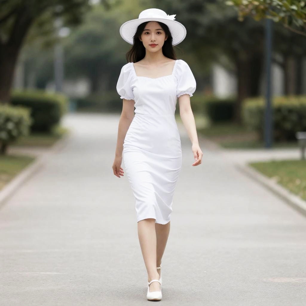 Young Asian woman walking confidently down a paved outdoor path wearing a white knee-length dress with puff sleeves and a square neckline, complemented by white Mary Jane shoes and a wide-brimmed white hat. The background features blurred greenery and trees, suggesting a park or garden setting.