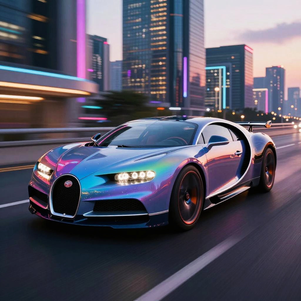 Rainbow Bugatti speeding down a futuristic neon city highway, sleek aerodynamic design reflecting vibrant multicolored light trails under a twilight sky, ultra-detailed hyper-realistic style with dynamic motion blur and shimmering reflections.