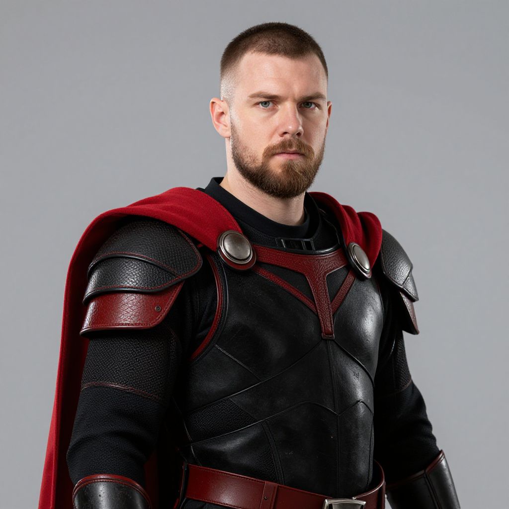 Man with short hair and beard wearing a black and red armor with a red cape.