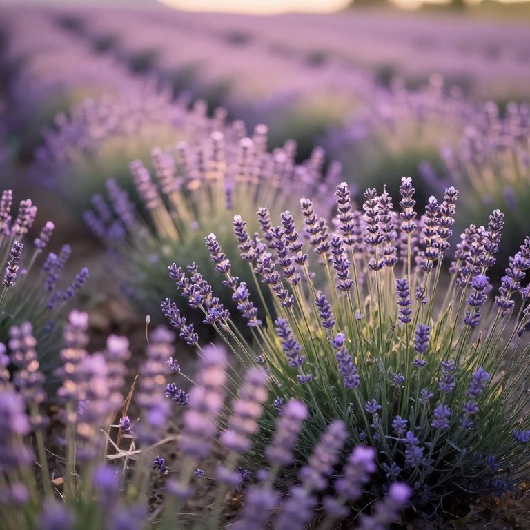 Photograph of a lavender field at sunset, showcasing vibrant purple flowers in sharp focus, with a softly blurred background of more lavender, creating a dreamy