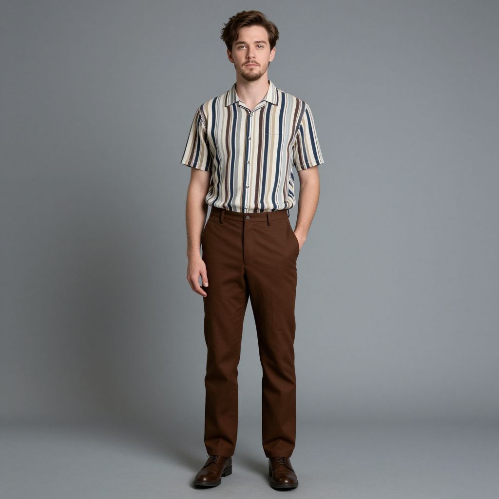 Photograph of a young, light-skinned man with short, dark brown hair and a trimmed beard, standing against a plain, light gray background. He wears a short-sleeved, black and white vertical-striped shirt with the top button undone, and dark brown, high-waisted trousers. His right hand is casually in his pocket, and his left arm hangs by his side. He has a relaxed, neutral expression and is wearing black dress shoes. The lighting is even, with no visible shadows, highlighting his casual yet slightly formal attire.