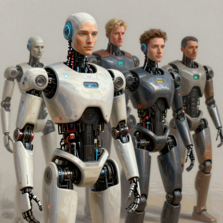 CGI image of five humanoid robots with different metallic colors and designs, standing in a row. Four have blue earpieces, one is silver. Background