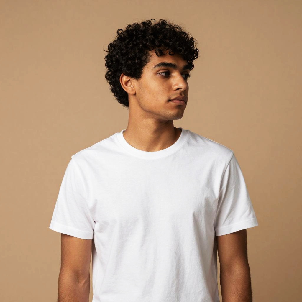 Photograph of a young man with medium-brown skin and curly black hair, standing against a plain beige background. He has a slender build and is wearing a plain white short-sleeve t-shirt. His expression is neutral, with his head slightly turned to the right and his gaze directed downward. The lighting is soft and even, highlighting his facial features and the simplicity of his outfit. The image has a slightly vintage, high-contrast effect, giving it a distinct, almost timeless quality.