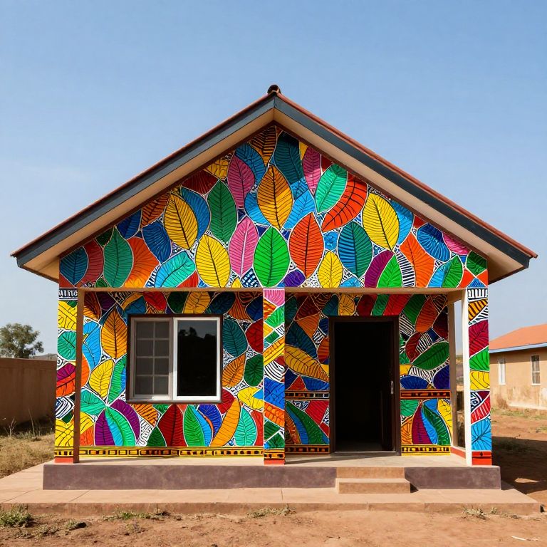 A vibrant Ndebele-inspired house features a colorful, patterned facade adorned with a lively mosaic of multicolored leaf shapes, showcasing traditional African artistry in a modern, high-definition rendering under bright, clear daylight.