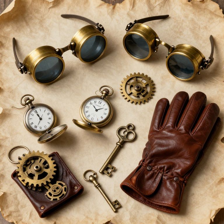 Steampunk paraphernalia collection featuring brass goggles, intricate pocket watches, leather gloves, gear mechanisms, and antique keys on aged parchment background, blending fantasy and Victorian industrial design in high detail.
