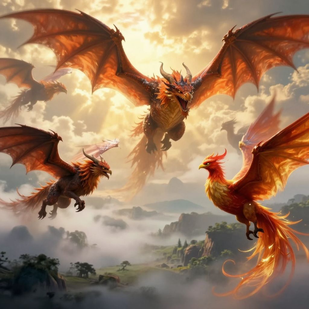 Mythic beasts soaring above mist-covered valleys, combining elements of dragons, griffins, and phoenixes, majestic wing spans and fierce eyes, dramatic clouds and golden sunlight breaking through, fantasy illustration, vibrant colors