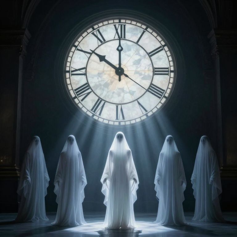 Photograph of four ghostly figures in white, flowing robes standing in a dark, dimly lit room with a large, illuminated clock in the background. The clock's Roman numerals and hands are clearly visible, with light beams emanating from the clock face. The figures, standing in a row with their backs to the camera, have hoods that obscure their faces, adding to the mysterious and eerie atmosphere. The floor is dark, contrasting with the bright, ethereal light from the clock. The overall mood is haunting and suspenseful, with a strong emphasis on light and shadow.