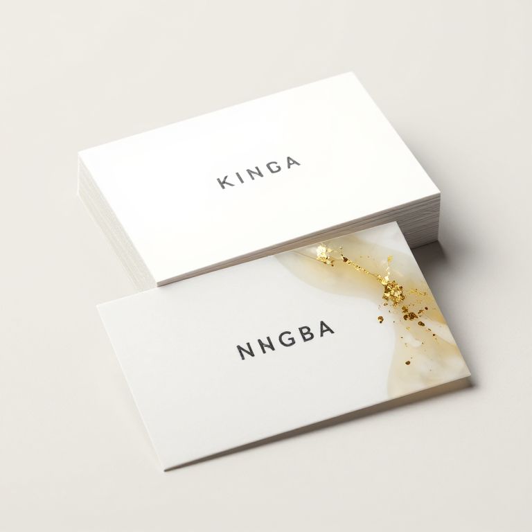 Photograph of two white business cards stacked slightly askew on a white background. Each card features the word "KINGA" in black, all-caps, sans-serif font. The visible card on top has a simple white background, while the partially visible card below has a decorative gold and white gradient with subtle gold speckles. The cards have a sleek, modern design with clean lines and minimalistic aesthetics. The edges of the cards are crisp and sharp, and the overall composition is bright and elegant.