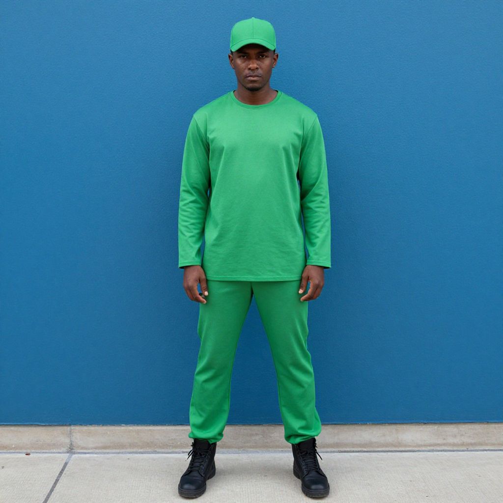 Photograph of a tall, dark-skinned Black man standing against a vivid blue wall. He wears a bright green long-sleeve shirt, matching green pants, and black sneakers. A green baseball cap complements his outfit. His expression is neutral, and he stands with his arms relaxed at his sides. The concrete ground beneath him is light gray, contrasting with the bold blue background and his green attire. The image has a sharp, colorful aesthetic with high contrast.