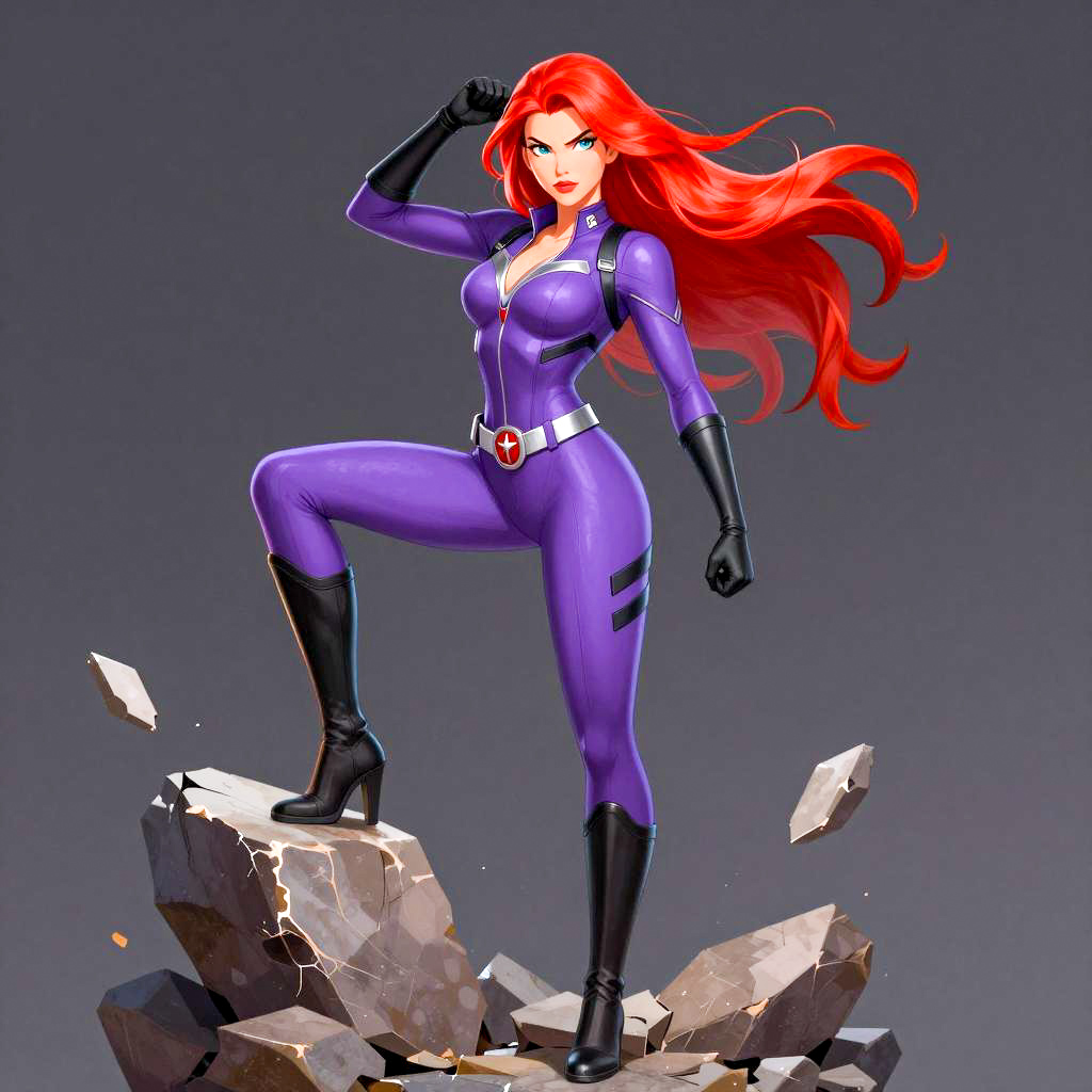 Digital illustration of a woman with fair skin and red hair in a side part. She wears a tight, yellow, shiny jumpsuit with a deep V-neck, white belt, and pink high heels. Her right hand is raised with palm open, while her left hand rests on her hip. She has green eyes, pink lipstick, and a confident expression. She stands against a black background.