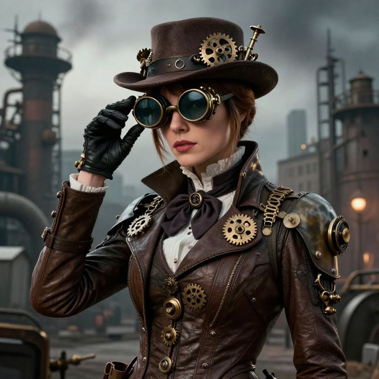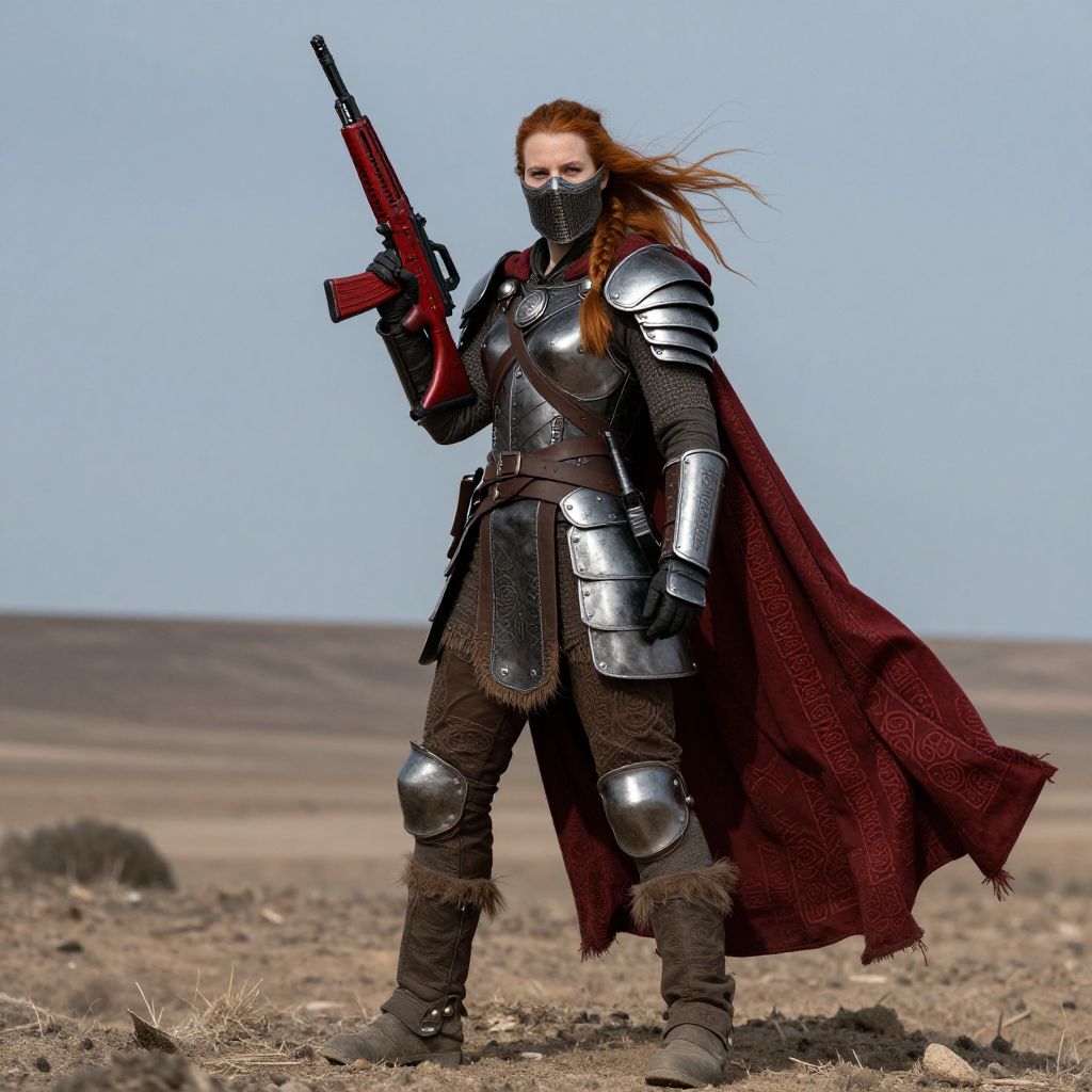 Photorealistic digital image of a fierce, green-eyed woman in pirate-style armor, holding a rifle, standing in a dusty, ruined urban landscape.