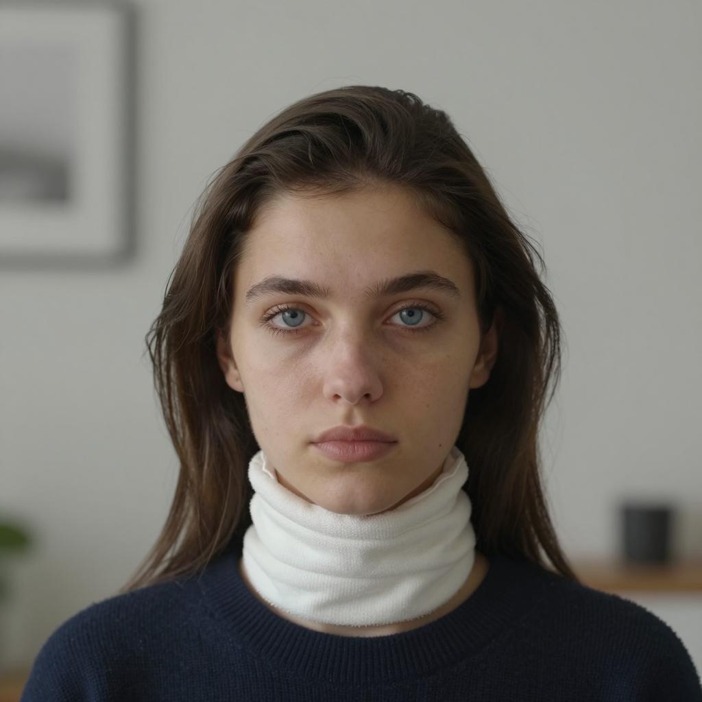 Close-up photograph of a young woman with long, dark brown hair with blonde highlights, pale skin, green eyes, and slightly parted lips. Her face is sweaty, with visible pores and a neutral expression. Soft, grey background. She looks slightly to the right.