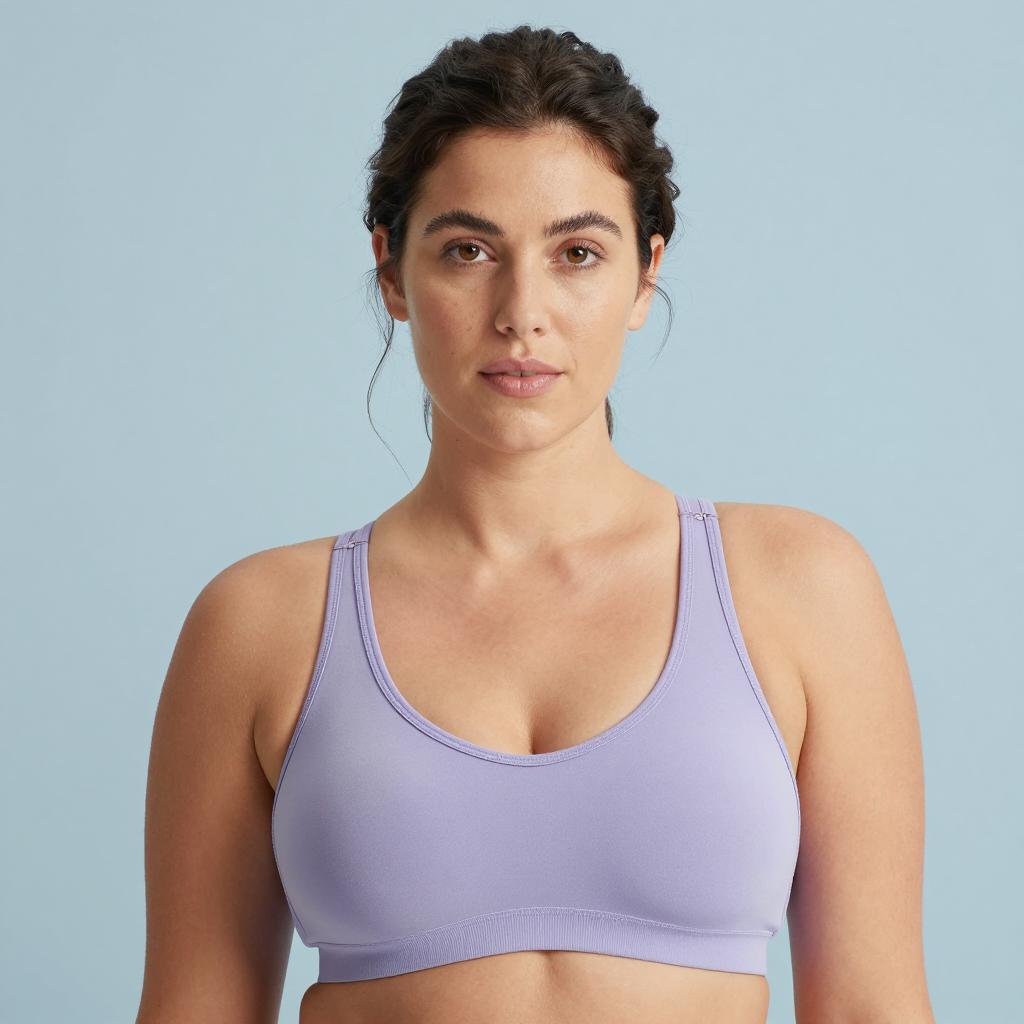 Photograph of a woman with fair skin, dark brown hair in a loose bun, wearing a lavender sports bra with thin straps. She has light brown eyes, neutral expression, and is against a light blue background. Her breasts are medium-sized, and the bra has a small central clasp. Her face is centered, and she is looking directly at the camera.