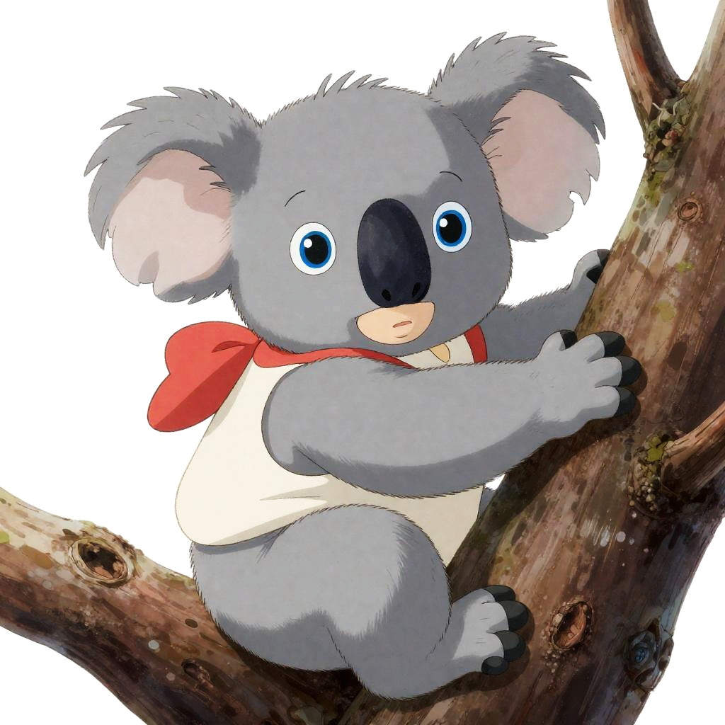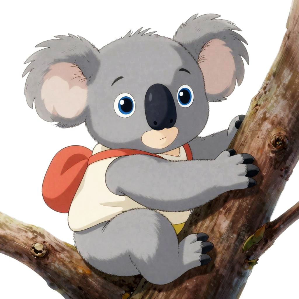 A baby koala depicted in a vintage children's book illustration, showcasing a velvety nose. Dressed in sporty attire, it displays a focused look while climbing a tree. Its bright blue eyes are wide open, illustrated as a complete character on a transparent background, embodying the playful essence of Ghibli-inspired cartoons.