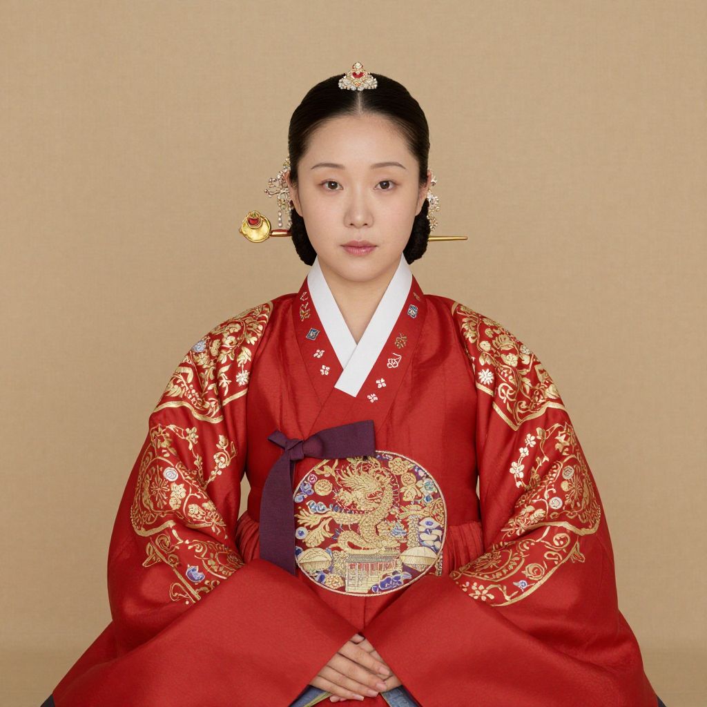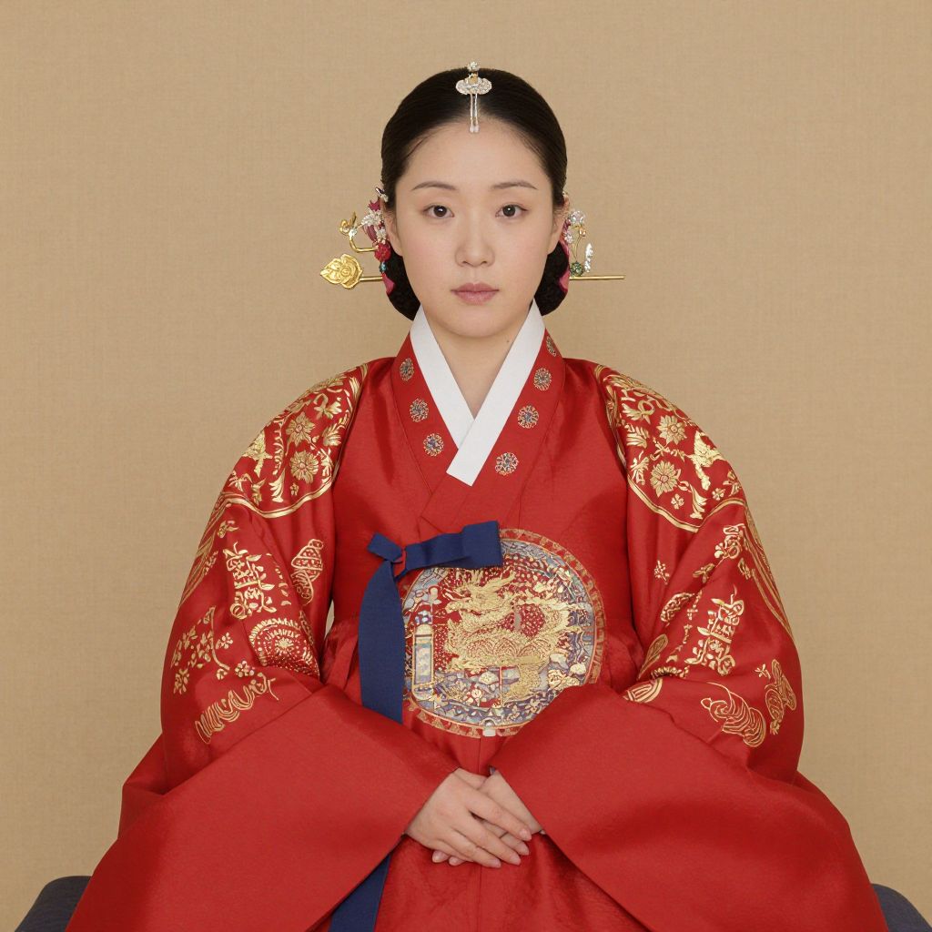 Photograph of an East Asian woman in an ornate red traditional Korean hanbok with gold embroidery, black hair in a bun, and gold hair
