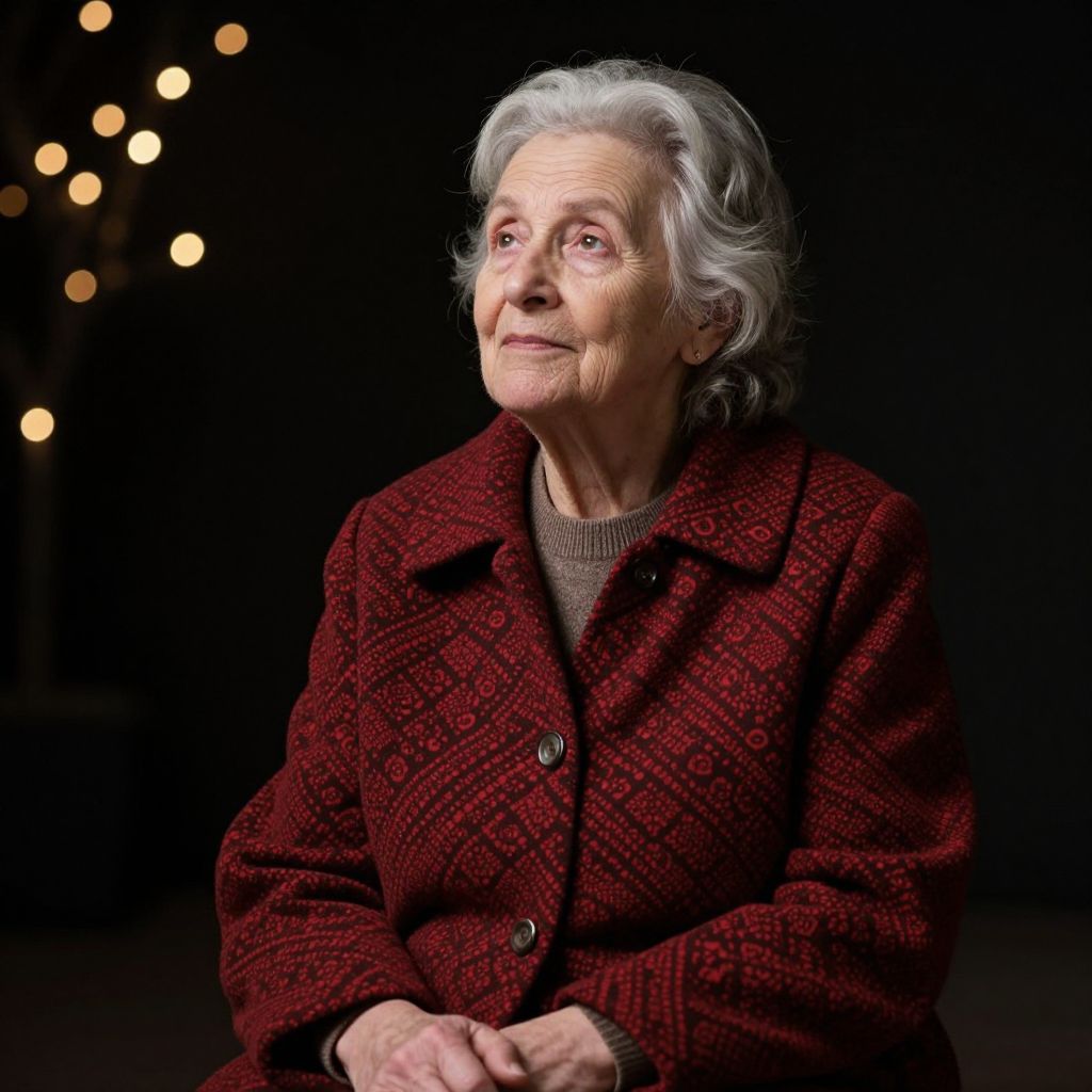 Elderly woman with silvery hair, wearing a red patterned coat over a brown sweater, sits gracefully against a dark background dotted with warm bokeh lights, exuding a serene and contemplative demeanor.