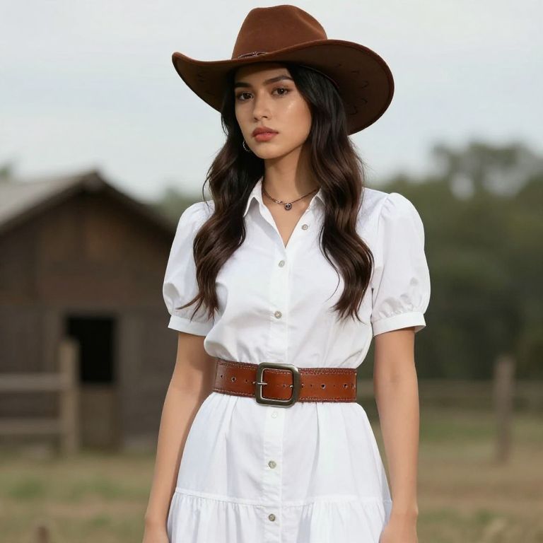 Female wearing a white dress with a brown belt and a cowboy hat.
