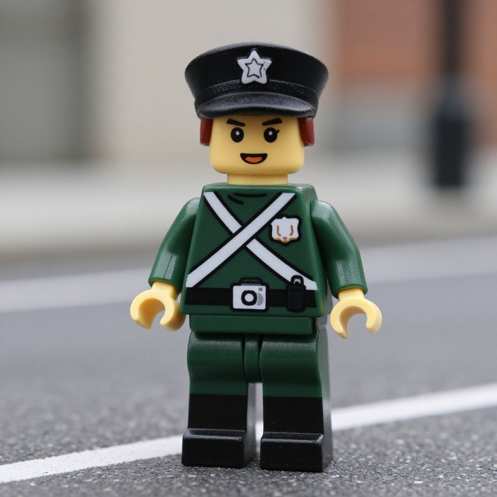 Photograph of a Lego minifigure in a green military uniform with a black cap, white cross strap, and star, standing on a gray asphalt