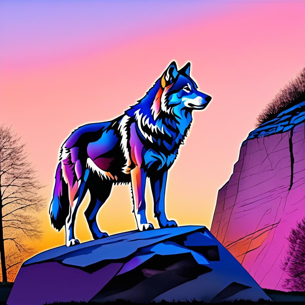Digital drawing of a wolf standing on a large rock in the Paris Zoological Park during a vibrant sunset. The wolf, turned to look at the observer, is depicted with bold blue, purple, and pink hues. The sky features striking orange and pink tones, while the foreground and surrounding rock formations are rendered in deep purples, creating a surreal and vivid atmosphere.