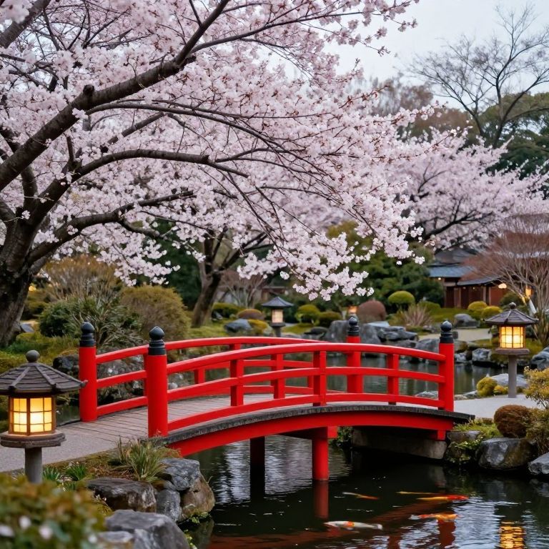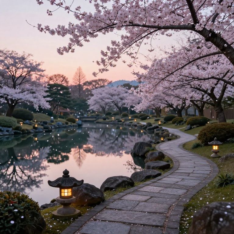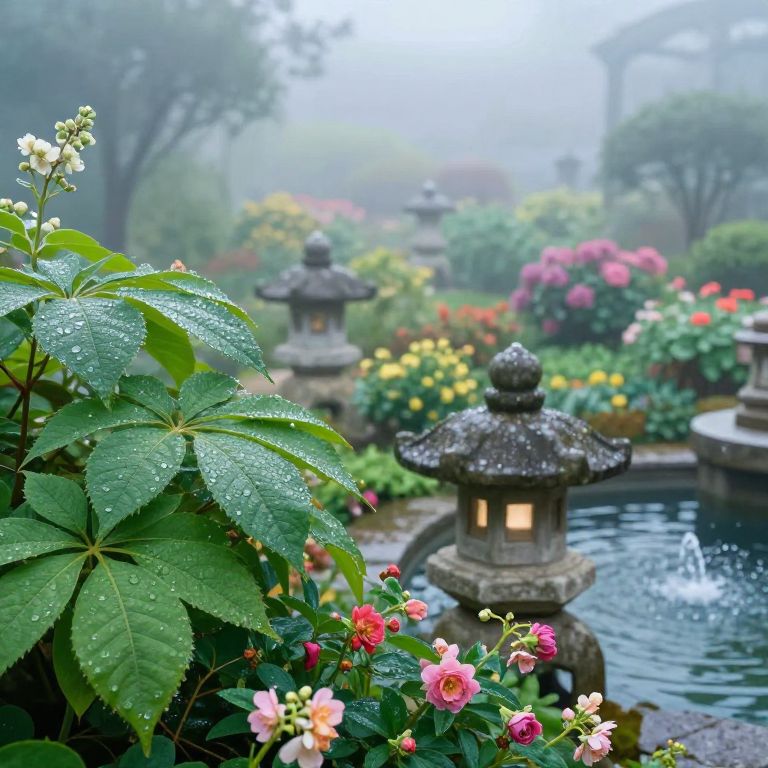 Gardenside morning mist, dew sparkling on vibrant green leaves and colorful blossoms, stone lanterns glowing faintly, a small fountain with crystal clear water, a calm, meditative ambiance, ultra-detailed botanical elements, soft pastel color palette