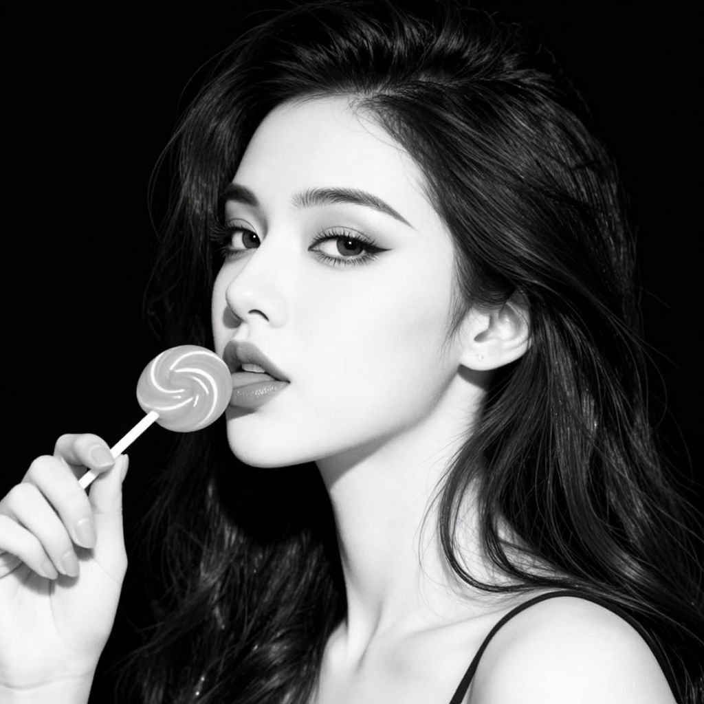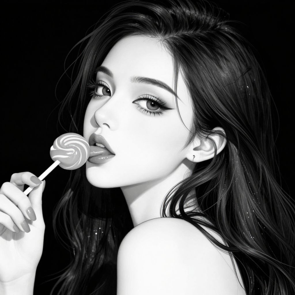 A high-contrast black-and-white anime-style illustration of a glamour woman with white skin in an artistic portrait composition, The woman is depicted at a slight angle, focusing on her elegant profile and lips, She is sensually enjoying a lollipop, creating an innocent yet sophisticated atmosphere, Her long, slightly wavy hair flows freely, framing her face beautifully, She has delicate facial features with expressive eyes and finely drawn lips, The lighting is dramatic with careful attention to shadows and highlights, creating depth and dimension, The background is minimalist dark, drawing full attention to the detailed character and the artistic presentation, The sharp contrasts emphasize the stylish and refined atmosphere of the composition, Parameters and LoRA models: lora:BlueFuture:0, 9 lora:EtherealBrushAnimev1, 0:0, 6 lora:Darkandsentimental:0, 7