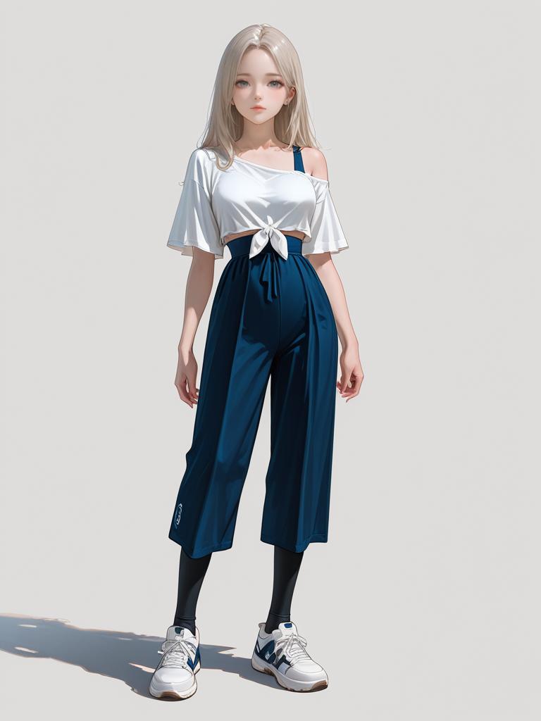 1girl, realistic face, full body shot, Woman, casual chic, ribbed two-piece set in lime green, short sleeve crop top with a collared neckline and button-up front, matching high-waist midi skirt with front button detailing and thigh-high slit, white low-top sneakers, minimal makeup, loose hair, plain white studio background.