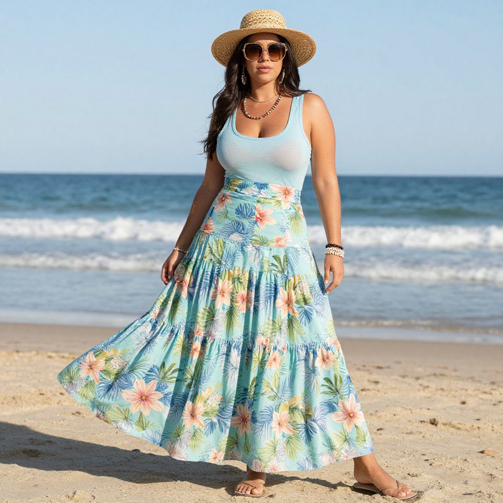 Full body shot, Pear-shaped body type woman, vibrant floral maxi skirt, lightweight cotton fabric, flowing silhouette, high-waisted design, soft pastel colors, tropical print, matching fitted tank top, breathable jersey material, scoop neckline, sleeveless style, relaxed fit, layered bohemian accessories, woven straw hat, oversized sunglasses, beaded bracelets, flip-flops, beachy vibe, sun-kissed skin, carefree attitude Sexy. Pretty face and beаutiful eyes. Big breasts