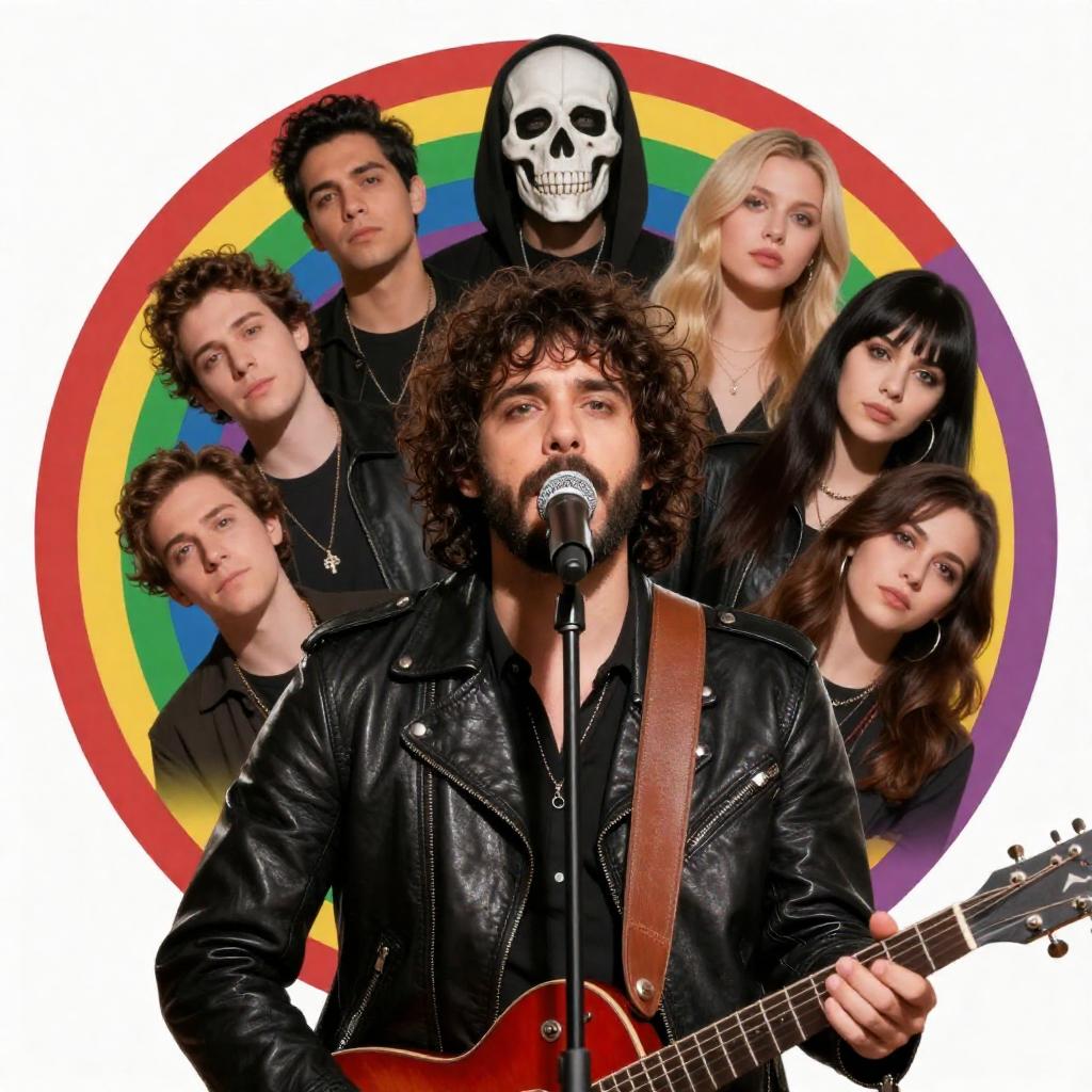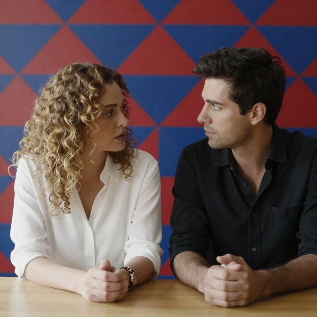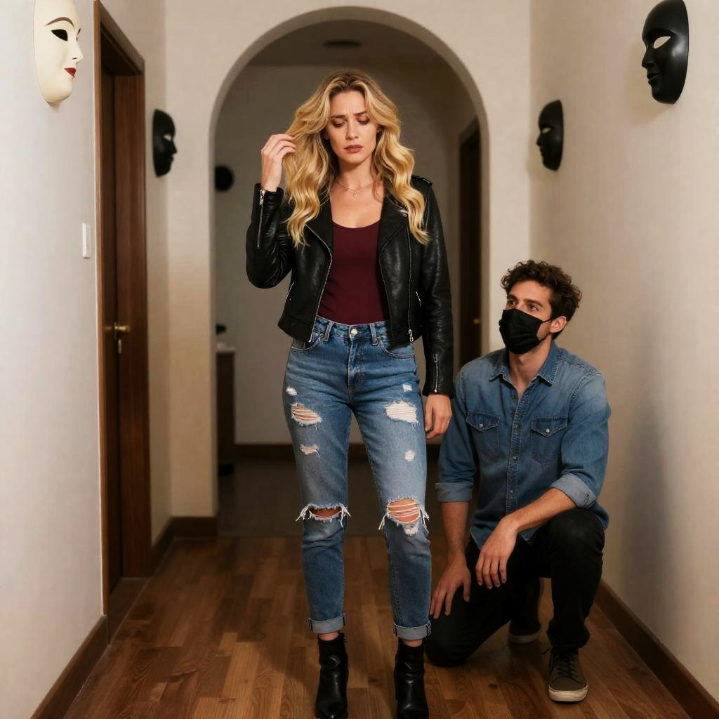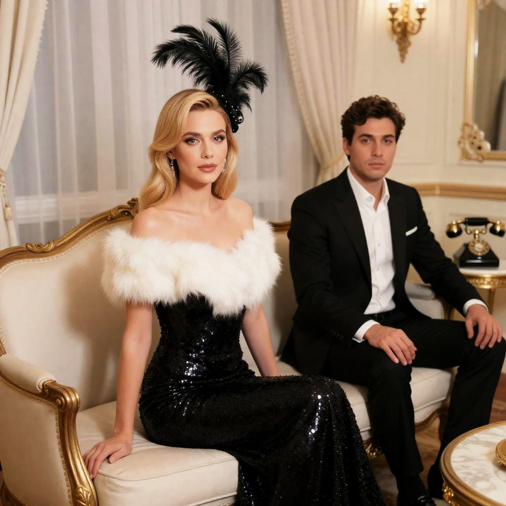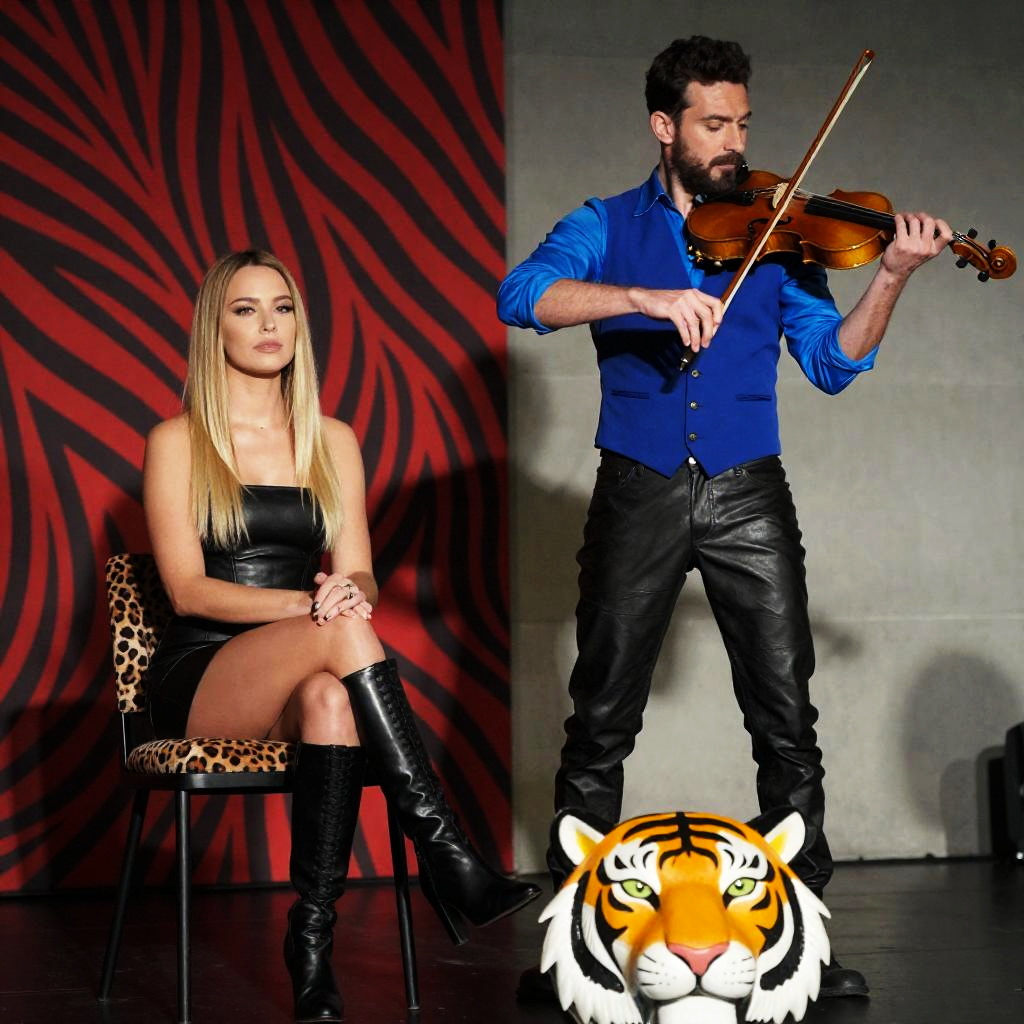 Photograph of two people on a stage. Woman with long blonde hair, leather strapless dress, and black leather boots sits on left. Man with beard, blue shirt, black leather pants, and blue vest stands on right, playing a violin. Background has red and black zebra-patterned fabric, leopard print chair, and concrete wall. Woman has neutral expression, man focused on violin. Tiger head prop in foreground. Bold, colorful, and dramatic.